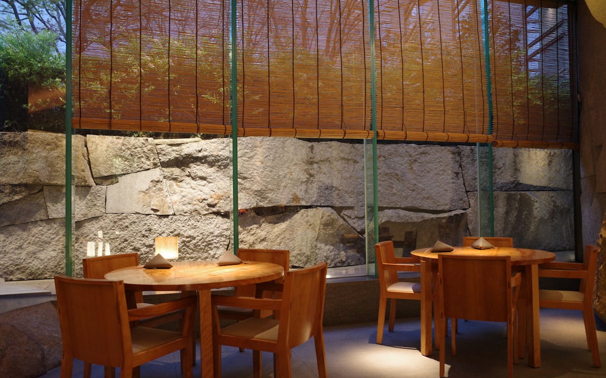 一歩店内へ足を踏み入れると、そこに広がるのは凛とした空気が流れる空間。内装には、香川県産の庵治石や木目の質感など自然の素材を活かし、細部まで趣向を凝らしています。
