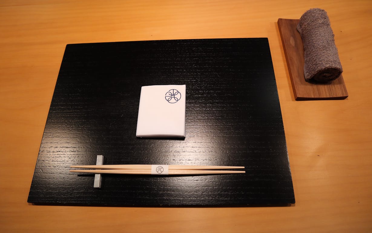 広尾のひっそりとした住宅街の中に、ポツンとたなびく小さな白い暖簾。店内に入ると、シンプルな造りに木の温もりを感じる心地よい空間が広がっています。温かいおしぼりをいただいて、早速特別コースが始まりました。