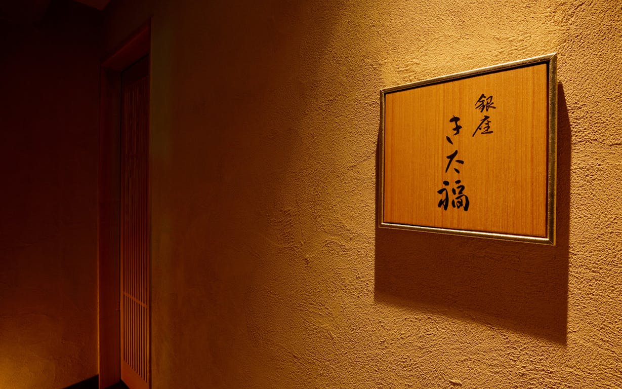 「銀座 きた福」があるのは、名だたる飲食店がしのぎを削る銀座7丁目。エレベーターでビルの3階まで上がると、優しい光に照らされた看板が現れます。