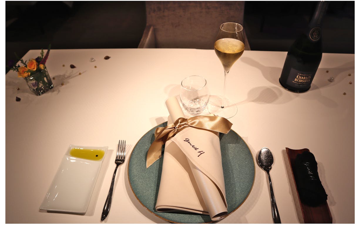 白金台というと煌びやかな設えのお店が多いですが、「ジョンティアッシュ」はメインストリートから一本外れた裏路地にひっそりとお店を構えています。暖色が多用されていて、シックでありながら温かみを感じ、気持ちが落ち着きます。かわいらしいテーブルセッティングを目で味わっていると、一皿目の前菜が運ばれてきました。