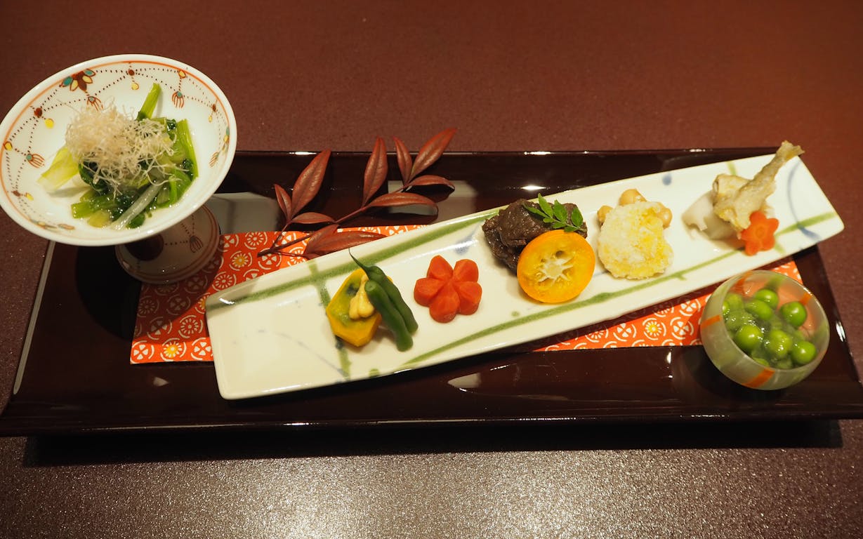 最初の一皿は前菜「七運盛」。「ん」が二つ連なった食材(にんじん、インゲン、なんきん、ぎんなん、レンコン、寒天、キンカン)を7つ使い、運気が上昇するよう願いを込めて作られたそうです。(前菜は季節によって変わり、七運盛は2月だけのメニューです)