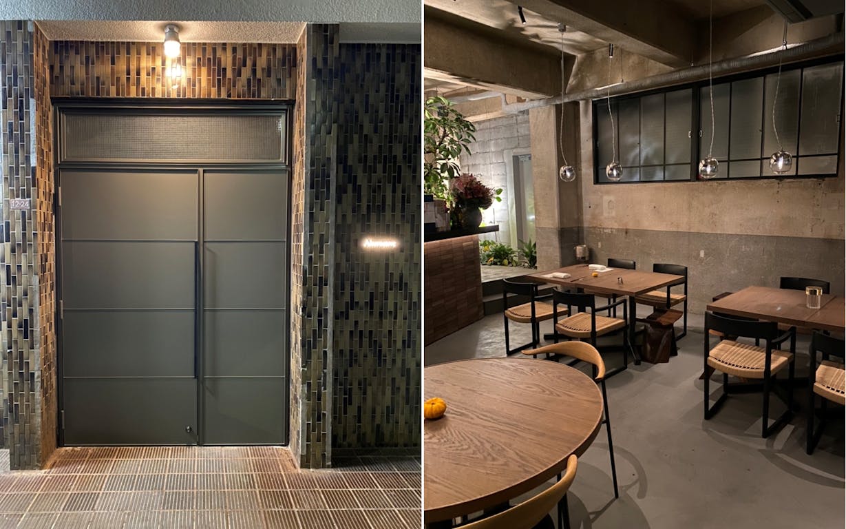 白金高輪と白金台の中間にある路地の工場跡に移転したフレンチレストラン「Alternative」。重厚な扉を開けると、インダストリアルを基調とした内装に柔らかさを感じるテーブルや椅子、そしてオープンキッチンのカウンターには青々とした植物が生い茂り、独特な空間が広がります。