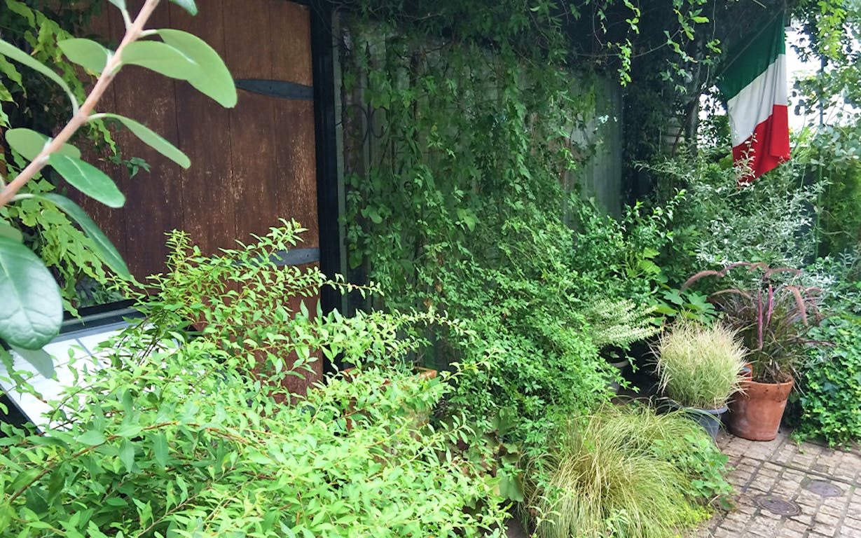 「リストランテ イル バンビナッチョ」が位置するのは、六本木通りから一本入った日赤通り沿い。実力派の店が立ち並ぶ、グルメな大人に人気のエリアです。たくさんのグリーンに囲まれた入口は、うっかりすると見落としてしまいそうな雰囲気。隠れ家感たっぷりの佇まいです。