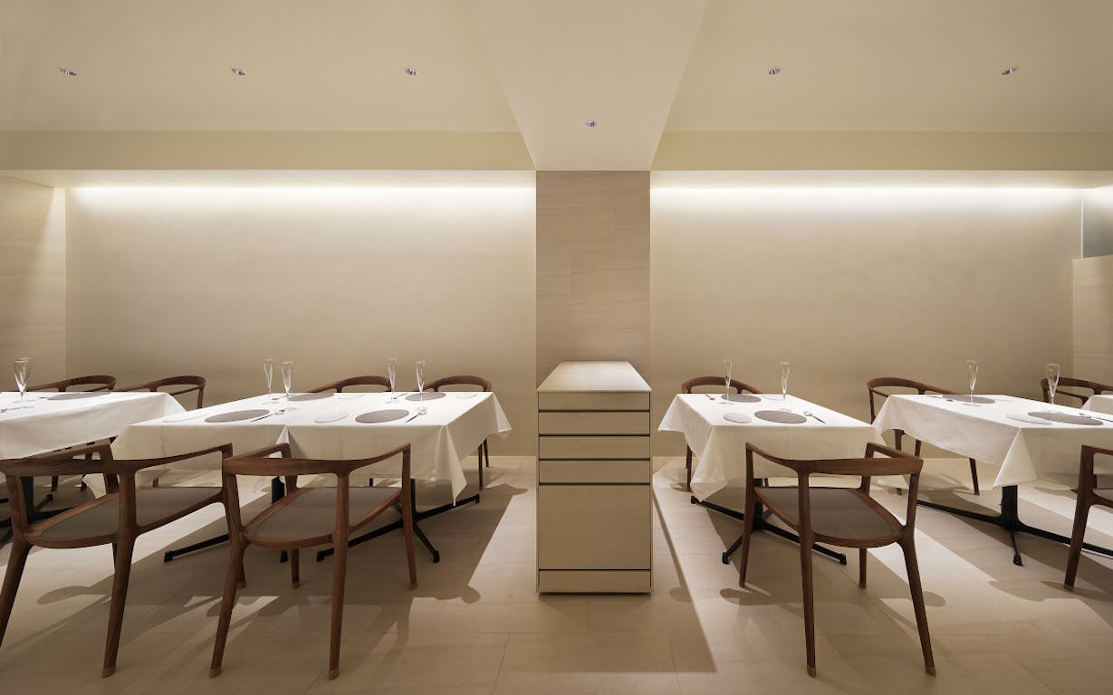地下鉄阿波座駅から徒歩4分ほど。緑眩しい靱公園やオフィス街に近接した界隈のビルの1階にあり、シンプルで都会的な店構えに迎えられます。店内は白を基調としたミニマルな設えで、木製の椅子の優しげな曲線が優美なアクセントに。静謐な中にもどこか温かみを感じさせる全14席の空間は、デートや記念日、そして女子会などにもおすすめです。