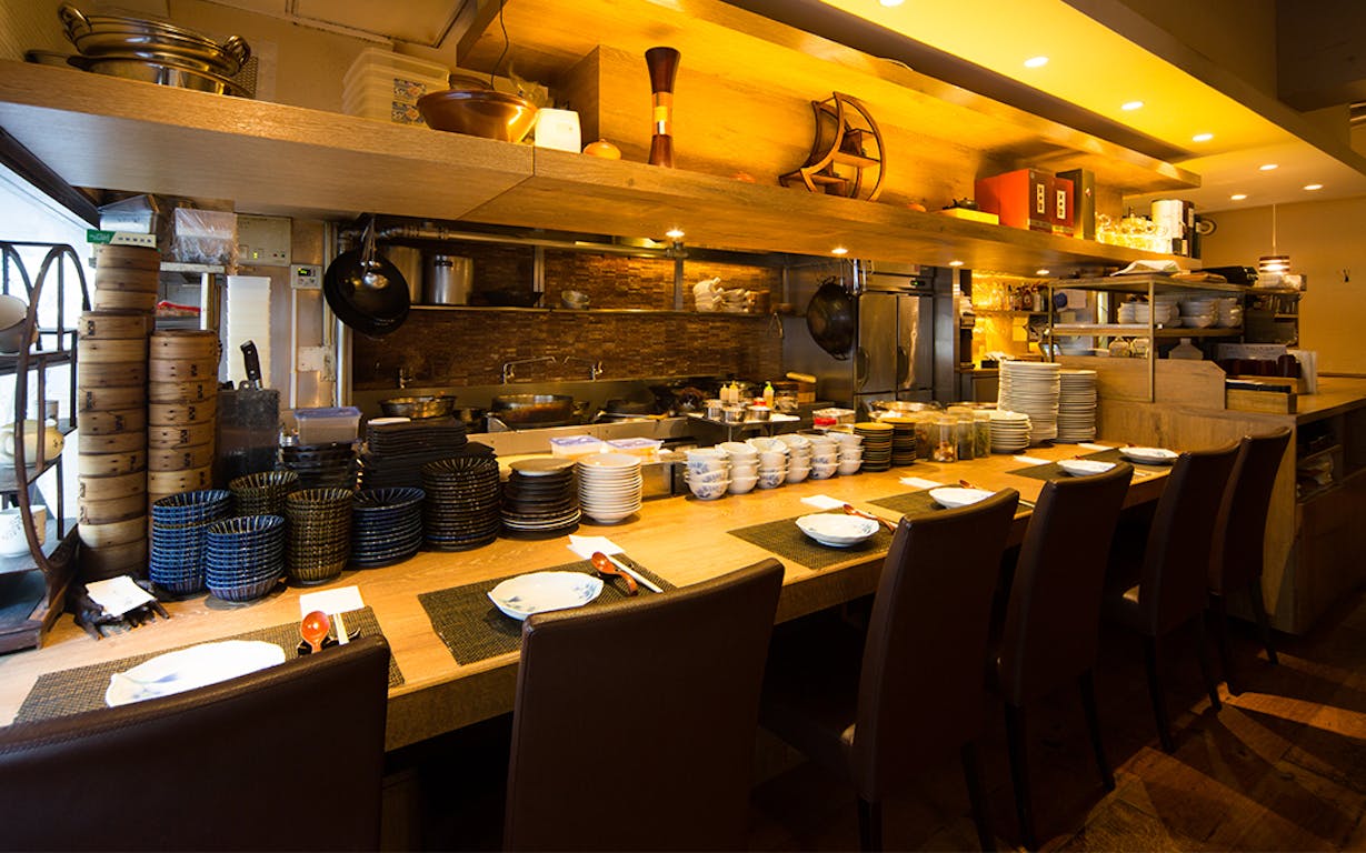 神楽坂の路地裏に店を構える「ENGINE」は、名だたる名店での修業経験を持つ松下和昌氏が腕を振るう中国料理店。全ての客席に目が届くようにしたかったという店内は、6席のカウンターとテーブル席で構成されており、どの席からも厨房の様子を眺めながら食事を楽しむことができます。