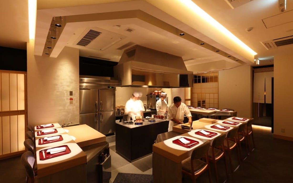 「紀尾井町 福田家」をはじめとする数々の名店で研鑽を積んだ料理長・小林和紀氏が、目の前で調理する一品がいただける「銀座 結絆」。コの字型のライブキッチンは臨場感抜群。料理を待つ時間も五感を刺激されることでしょう。