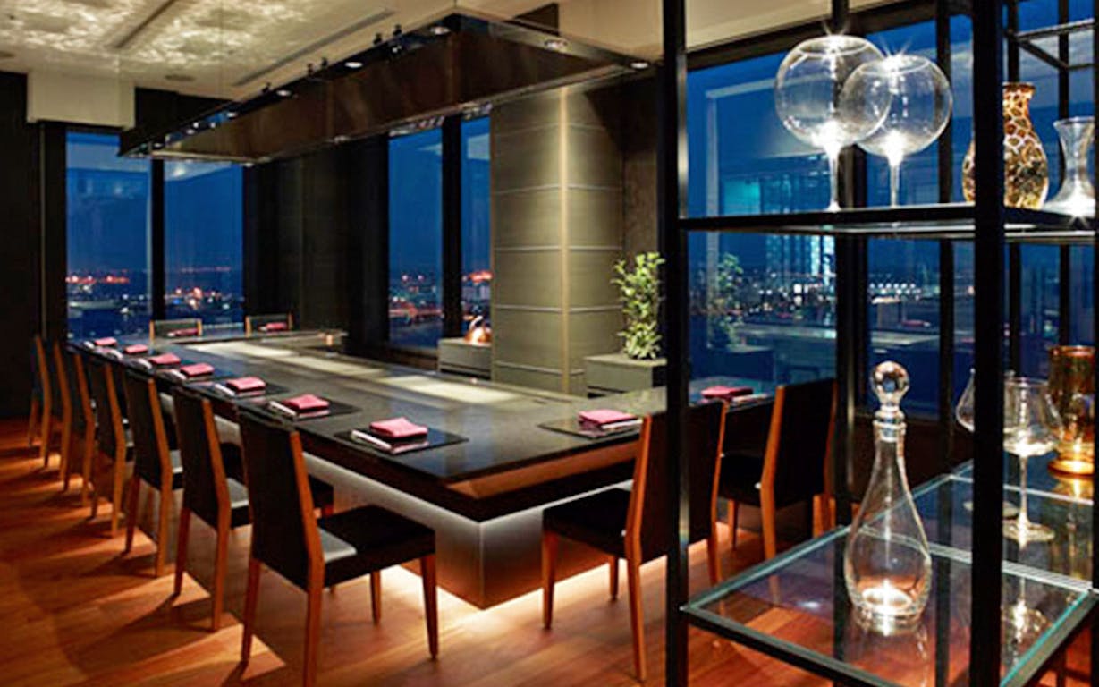 神戸・元町駅から徒歩圏内、ベイエリアを一望する高層ホテル「ホテルオークラ神戸」。その最上階に位置しているのが「鉄板焼 さざんか」です。特等席とも言える窓際の鉄板カウンターは、大きく取られた窓が開放感たっぷり。昼の景色はもちろん、夜になれば市街地の煌びやかな光がロマンティックなひとときを演出してくれます。