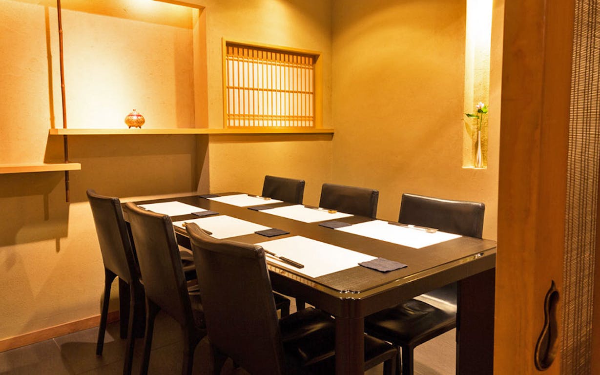 銀座2丁目の路地裏に佇む日本料理店「ぎんざ 一二岐」。行灯の明かりを目印に階段を下りると、檜のカウンターと2つの完全個室を備えた静謐な空間が広がります。洗練された設えは、接待や会食などのシーンにぴったり。完全個室はそれぞれ4名または6名まで利用可能なので、ゲストの数に合わせて選べるのも嬉しいですよね。