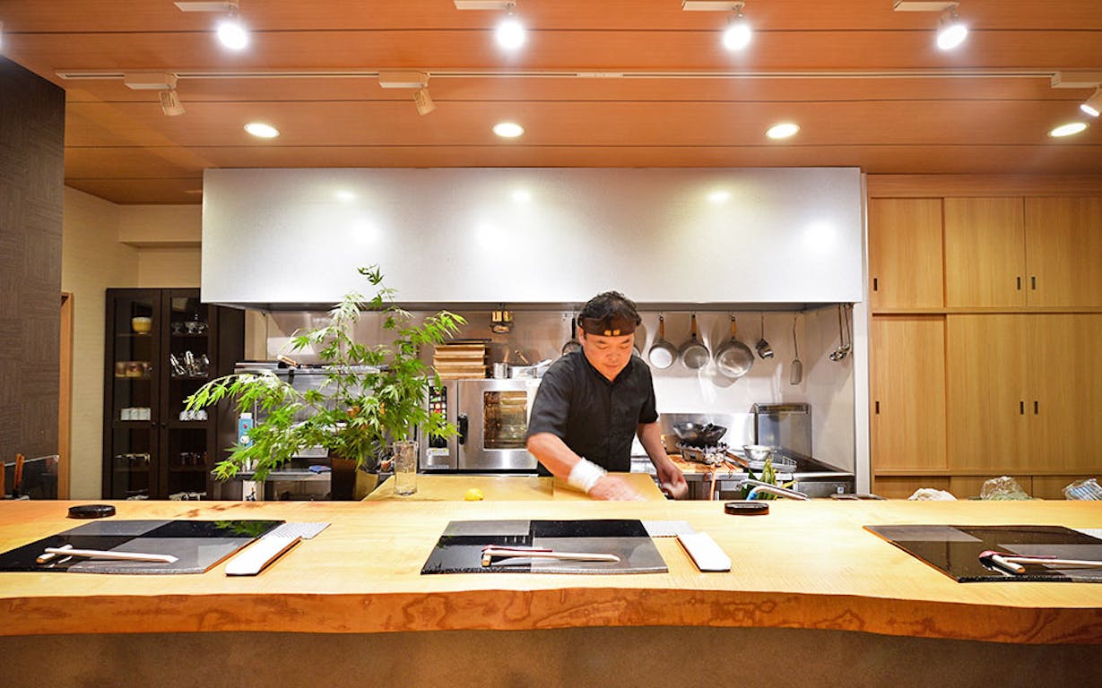 福井駅より車で約5分のところにある「滝の川 別邸」。目の前で調理風景を眺められるライブ感満載のカウンターは、店主・荒矢純一氏との会話も楽しめるおすすめの席。テーブル席を設けた個室もあるため、大切な人との利用にもぴったりです。いただけるのは、水揚げされた新鮮な魚介類を、荒矢氏がその日いちばんの逸品に仕上げた料理の数々。