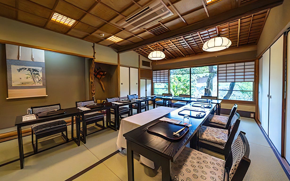 世界遺産・下鴨神社の「糺の森」沿いに店を構える「吉泉」。店内は趣のある調度品や生け花など、季節の設えに彩られた凛とした空間です。カウンター席のほか、個室を完備しているため、接待や特別な日での利用にも打ってつけでしょう。