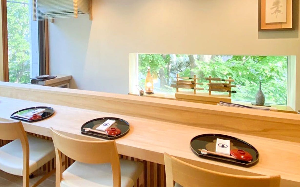 自然豊かな円山西町の閑静な住宅街に佇む「日本料理こまつ」。誘われるかのように暖簾をくぐり、地下への階段を降りると店内の入口が見えてきます。店内は、外の景色を楽しめるよう大きな窓が設置されている開放的な空間。北海道の自然を凝縮したかのような風景が、食事の味をより一層引き立てます。