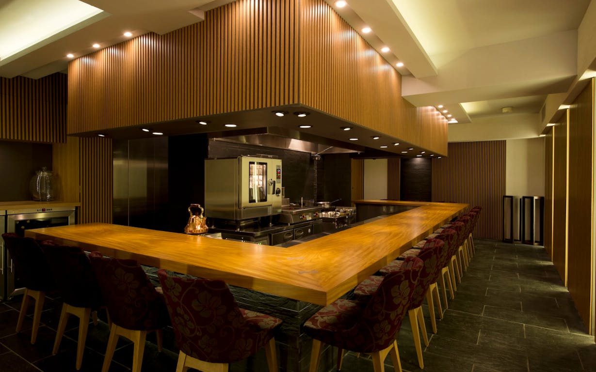 六本木の大通りから路地を少し進んだ場所に位置する「虎峰」。店内はすべての席から職人の手さばきを眺めることができる、コの字型のカウンターのみの設えです。