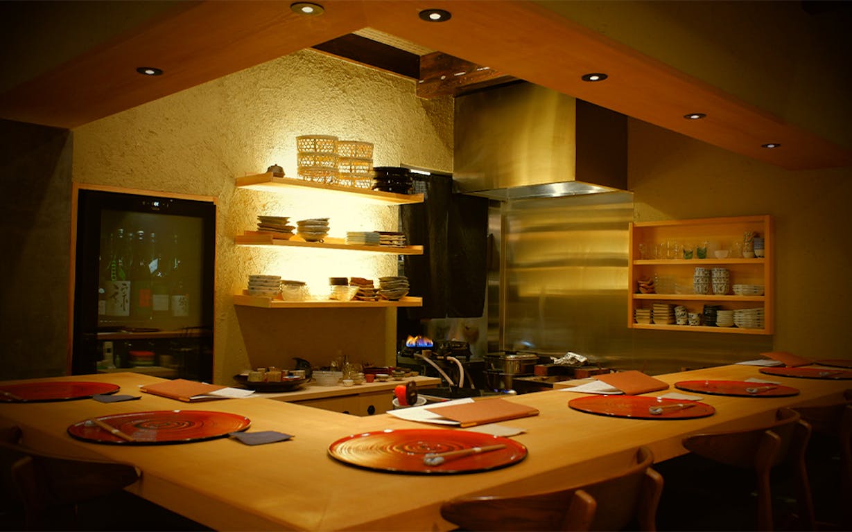 “地産外消”をテーマに厳選する国産・無農薬の食材を始め、使用する食器や設えなど、店内随所に作り手の思いが溢れています。シェフとの会話も肴に、目の前で仕立てられる季節感たっぷりのコースを堪能。ワインも珠玉の国産が揃います。