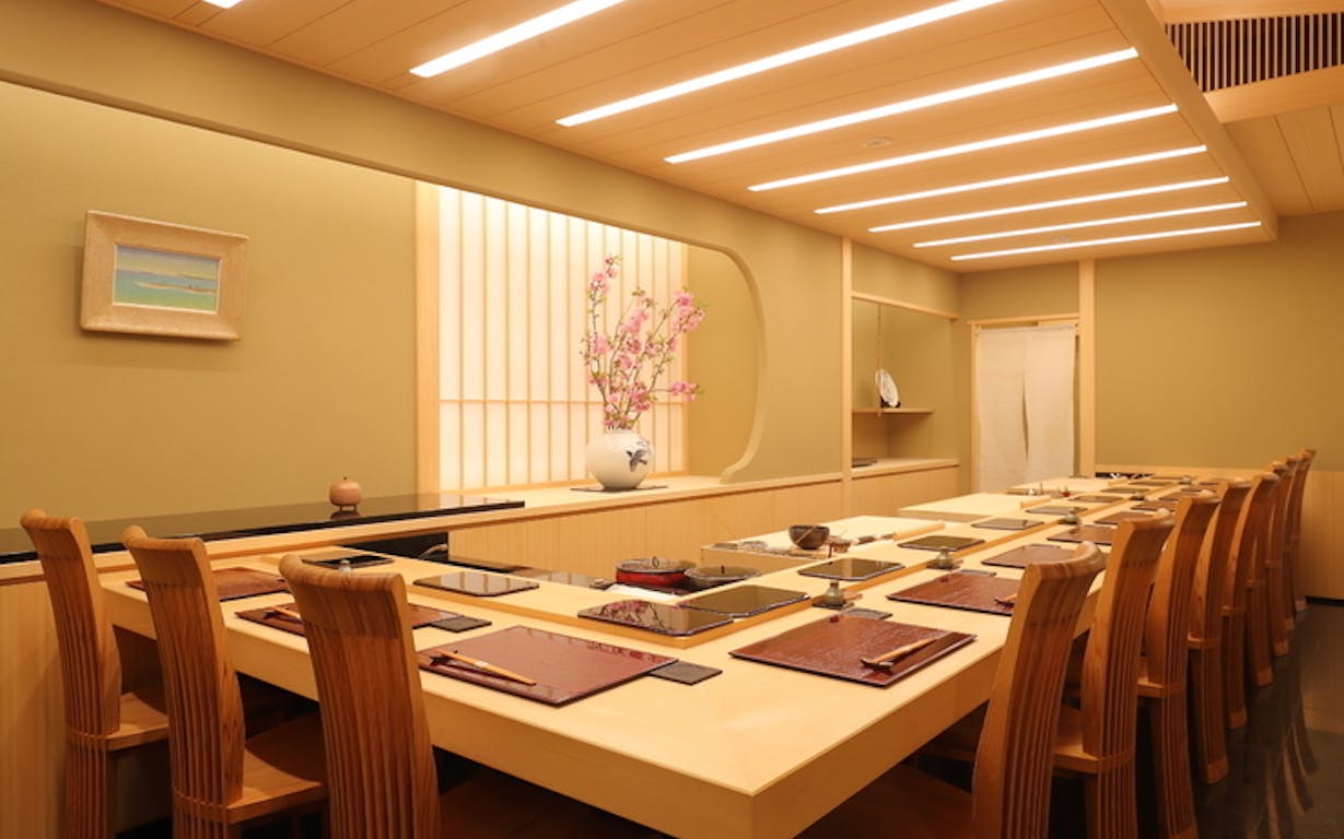 美食の街・銀座に店を構える「青空(はるたか)」は、『ミシュランガイド東京2021』にて二つ星として掲載された名店。木の風合いが漂うカウンターは、席間のあるゆったりした造りに。テーブル個室も用意されており、隣席に気兼ねなく食事を愉しむことができます。